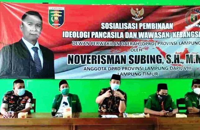 Hal itu dikatakan anggota Fraksi Partai Kebangkitan Bangsa (FPKB) DPRD Lampung, H. Noverisman Subing dihadapan kader GP Ansor, saat Sosialisasi Pembinaan Idiologi Pancasila dan Wawasan Kebangsaan, di Gedung Nahdatul Ulama (NU) Lampung Timur, Sabtu (27-05-2021).